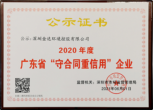 近期,深圳市市場(chǎng)監(jiān)督管理局公示了2020年度廣東省守合同重信用企業(yè)審核結(jié)果,深圳金達(dá)環(huán)境控股有限公司憑借規(guī)范治理和誠(chéng)信經(jīng)營(yíng)榮獲廣東省守合同重信用企業(yè)稱(chēng)號(hào)。